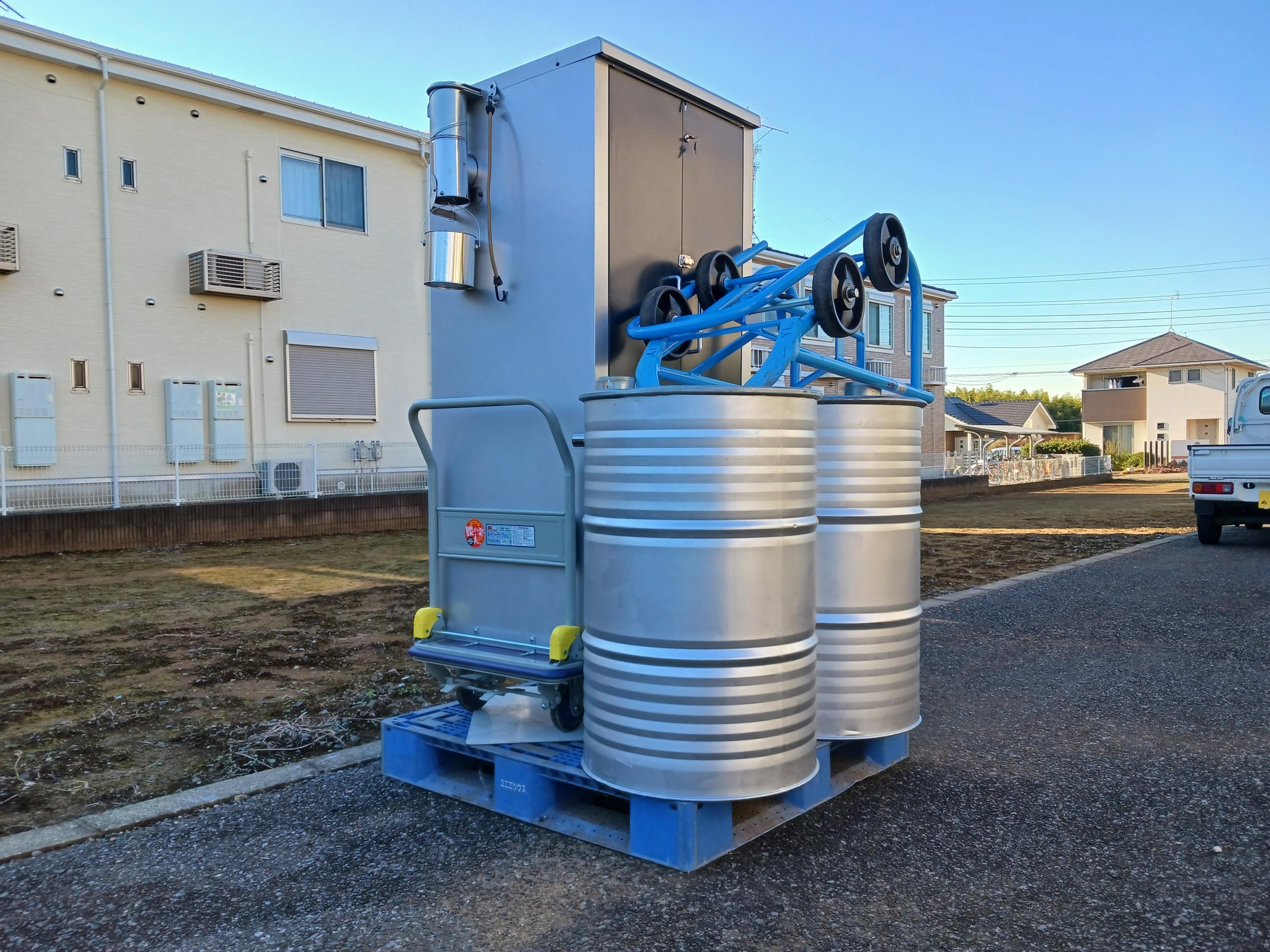バイオ炭製造機、しんちゃんのバレットの荷姿 荷おろしには、 フォークリフトか、3~4人での 手おろしの手伝いが必要になります。 | [ドラム缶型燃焼部]は製造能力の向上で必要な数を 追加で注文出来ます。 ※キャツチャーはセット価格に含まれています。 |